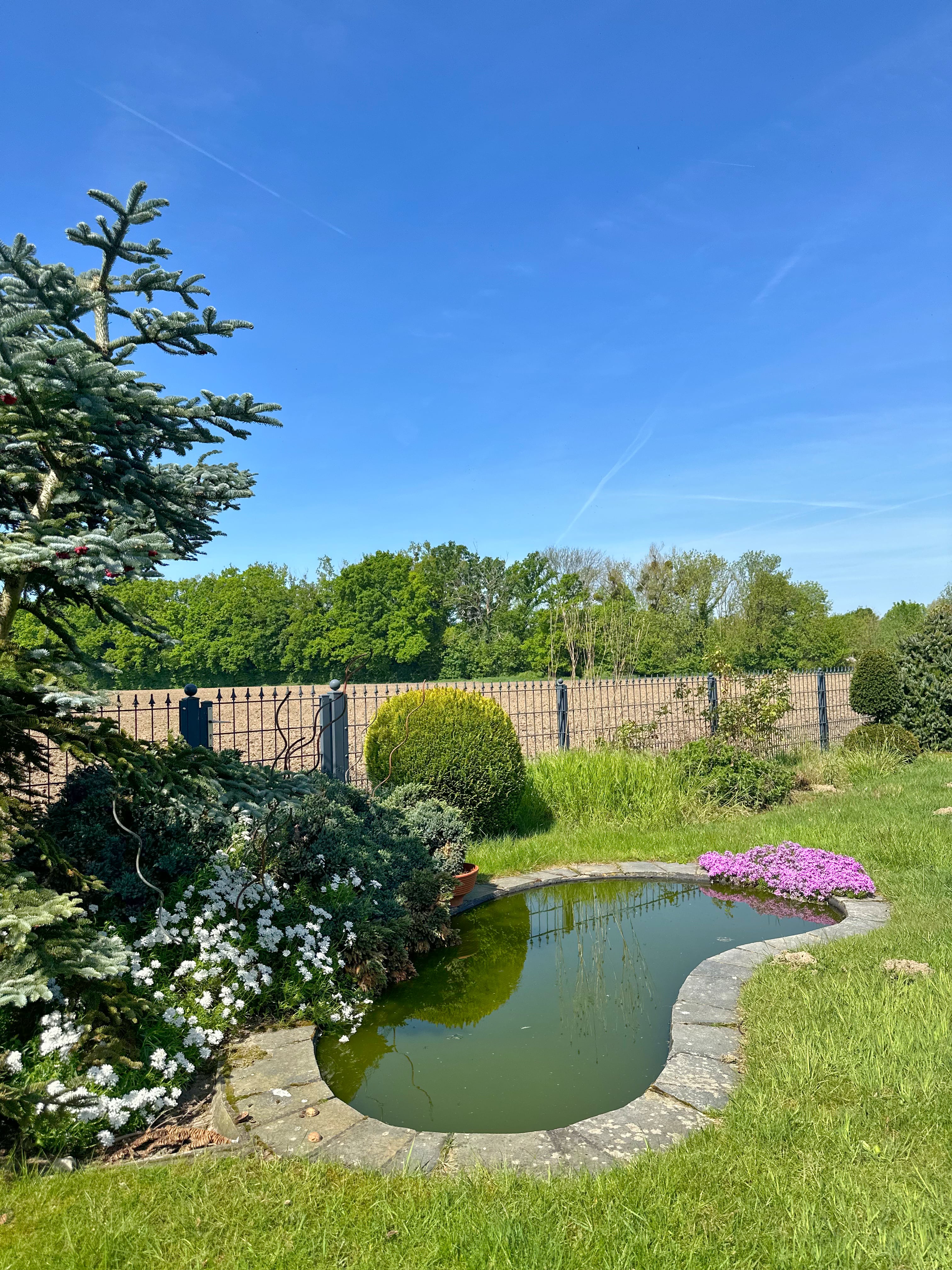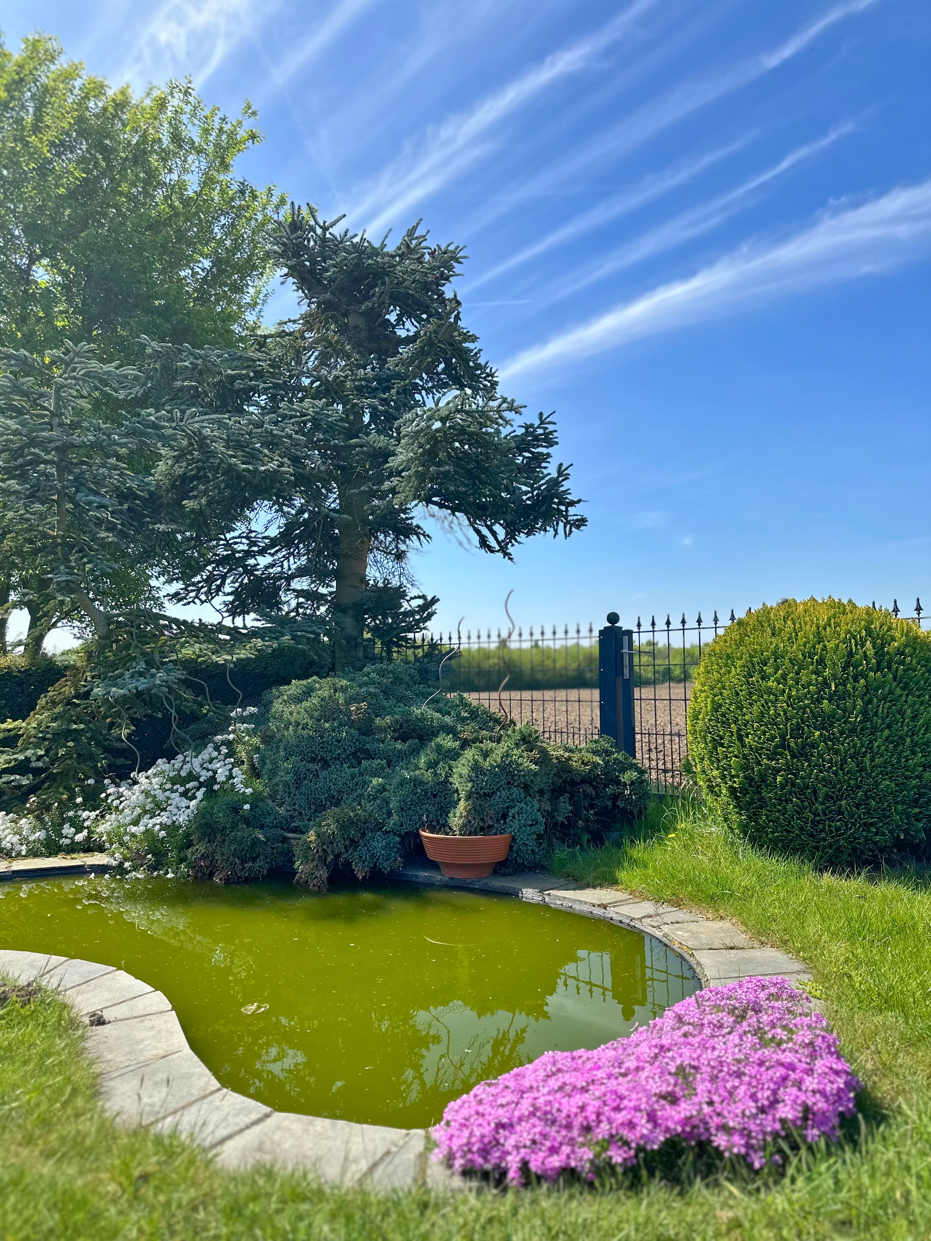 - Außenbereich: überdachte Terrasse, Garten mit Teich und Blumenbeeten