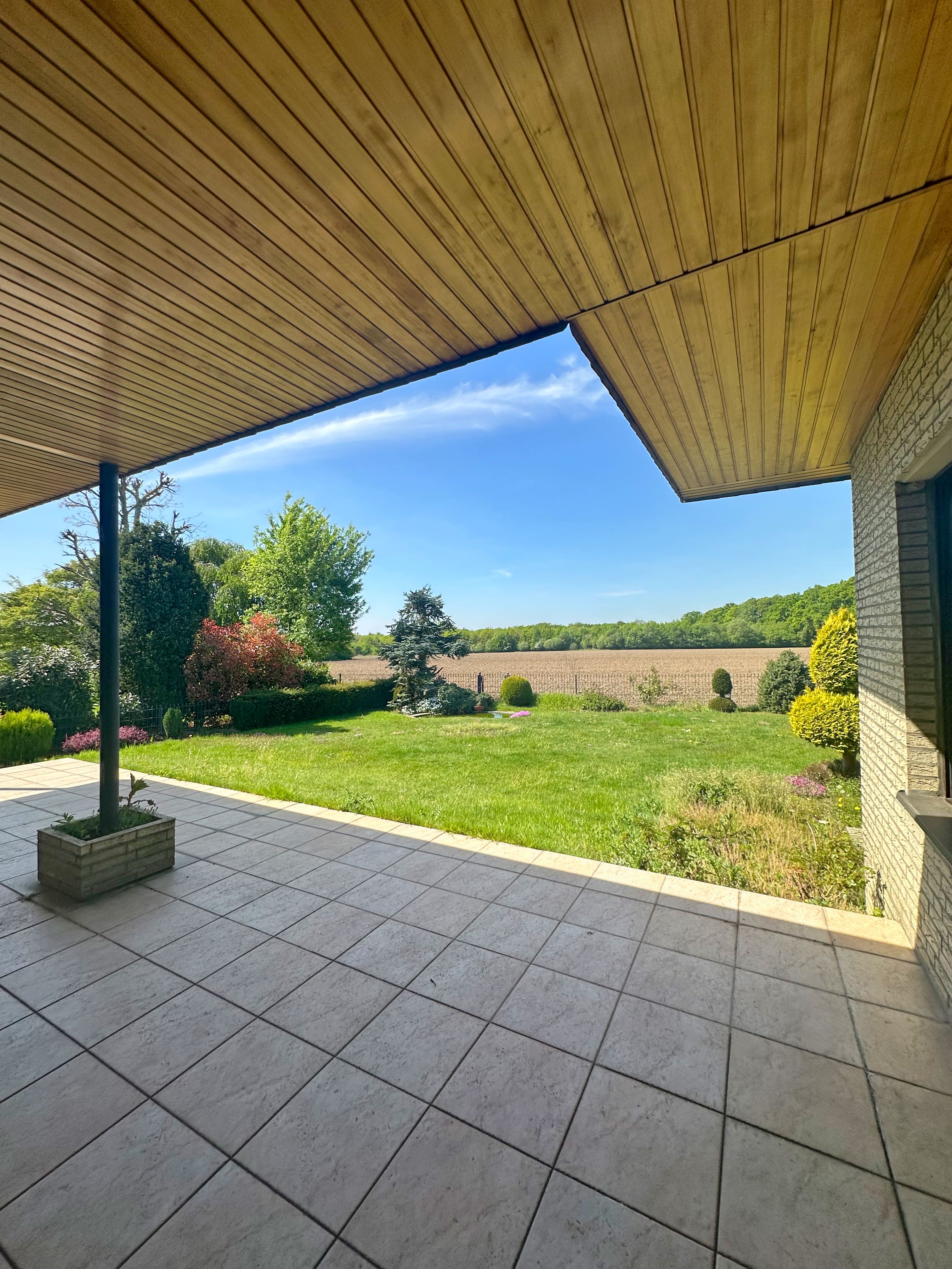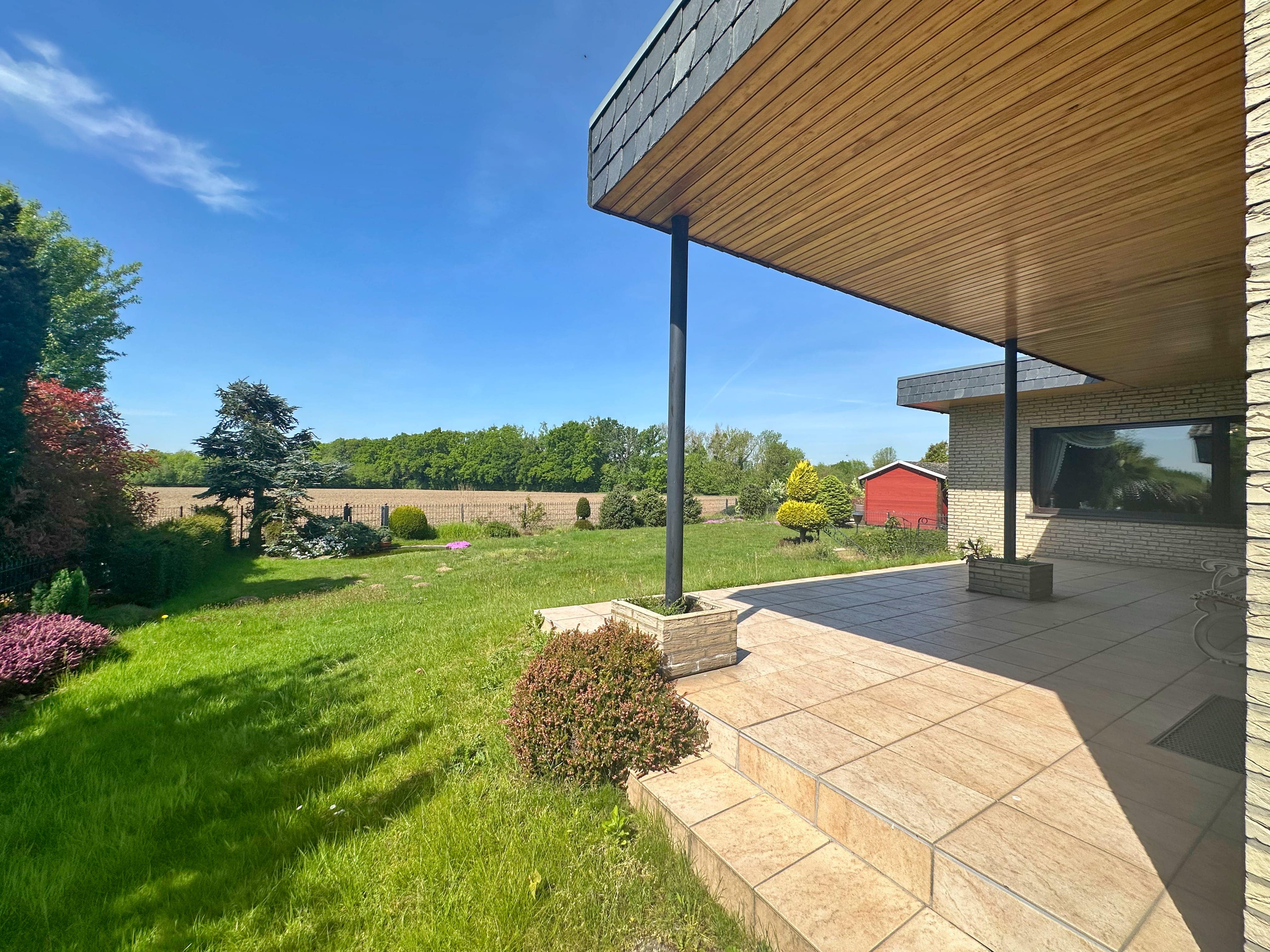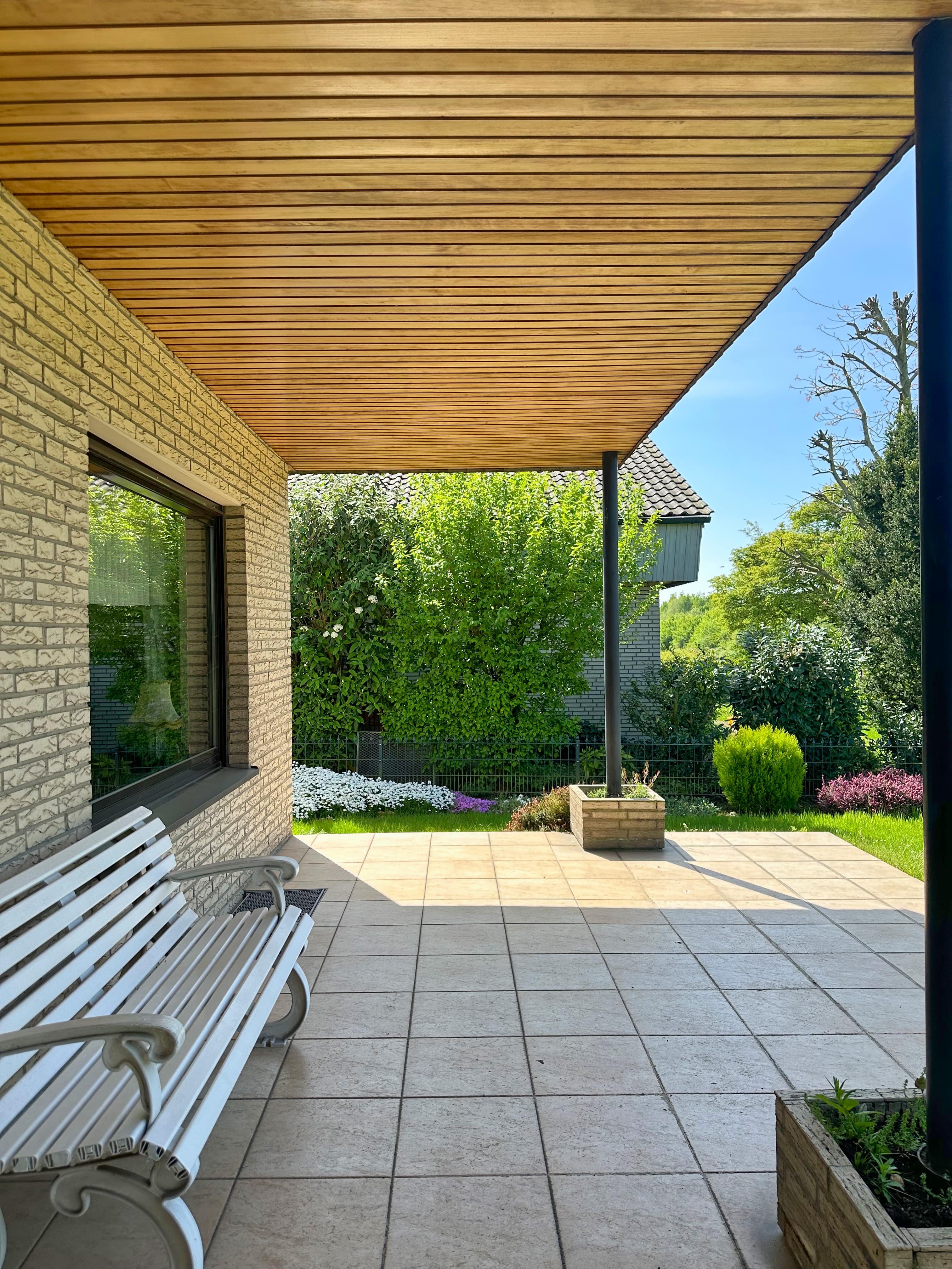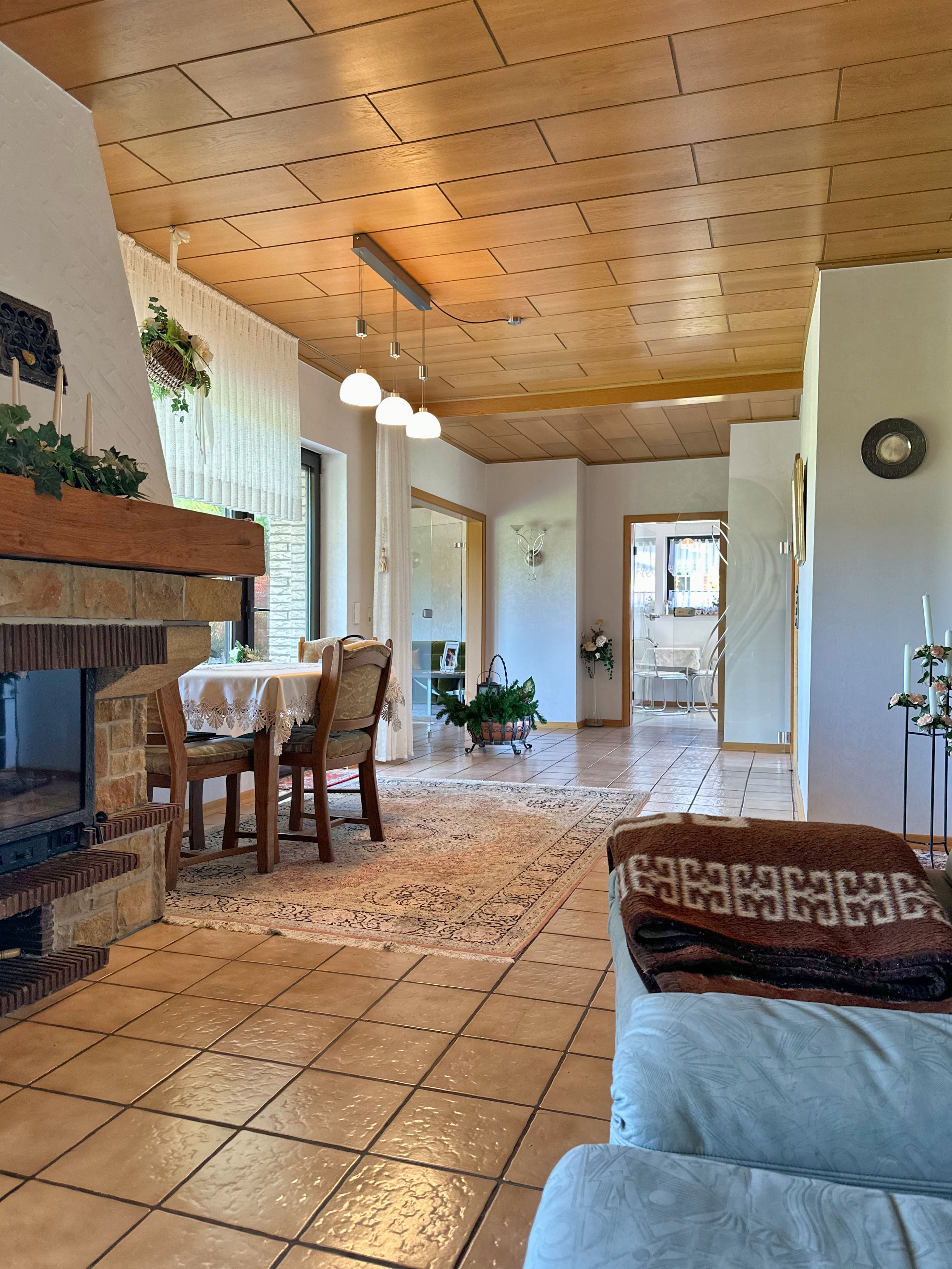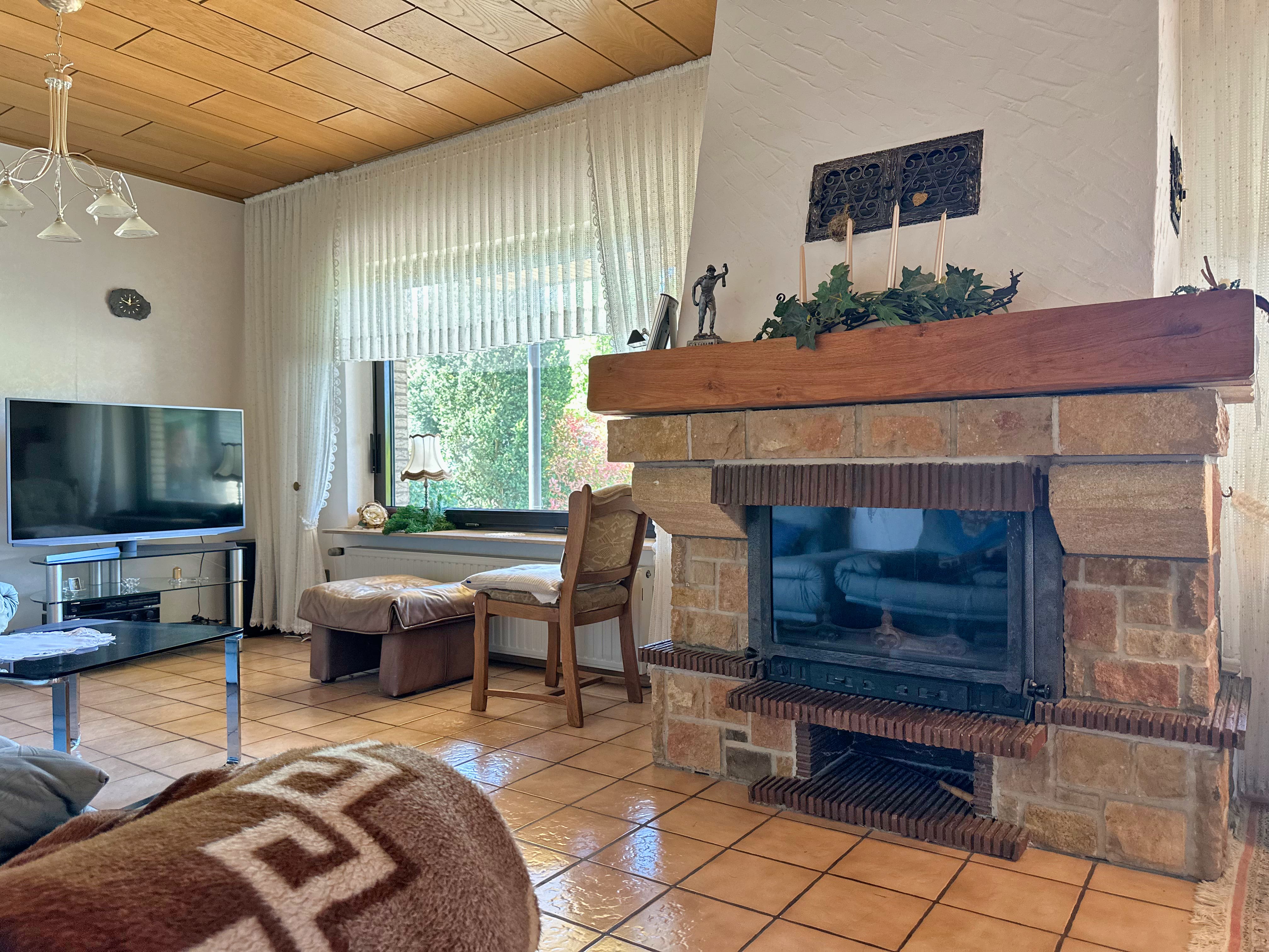 Vom Wohnbereich neben dem Kamin aus gelangt man direkt auf die großzügige, überdachte Terrasse, die einen wunderbaren Blick auf Feld und den Trimm Dich Wald bietet.