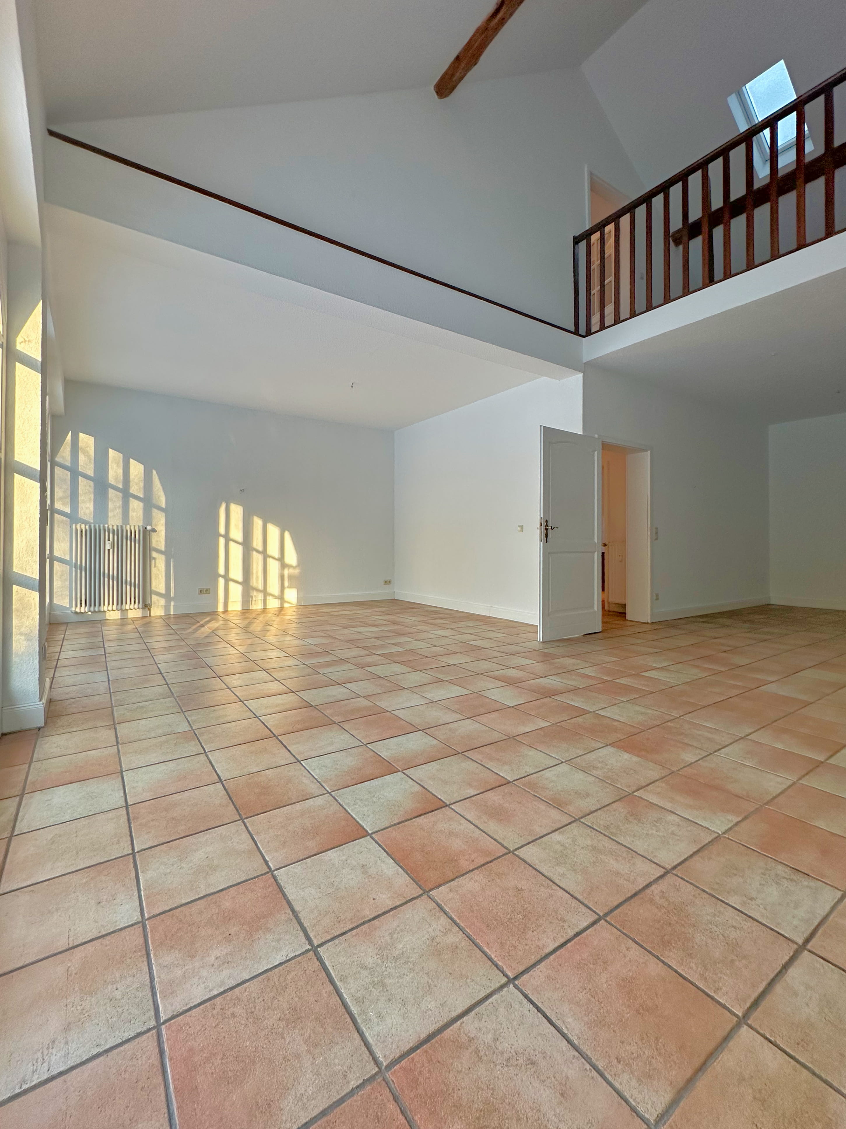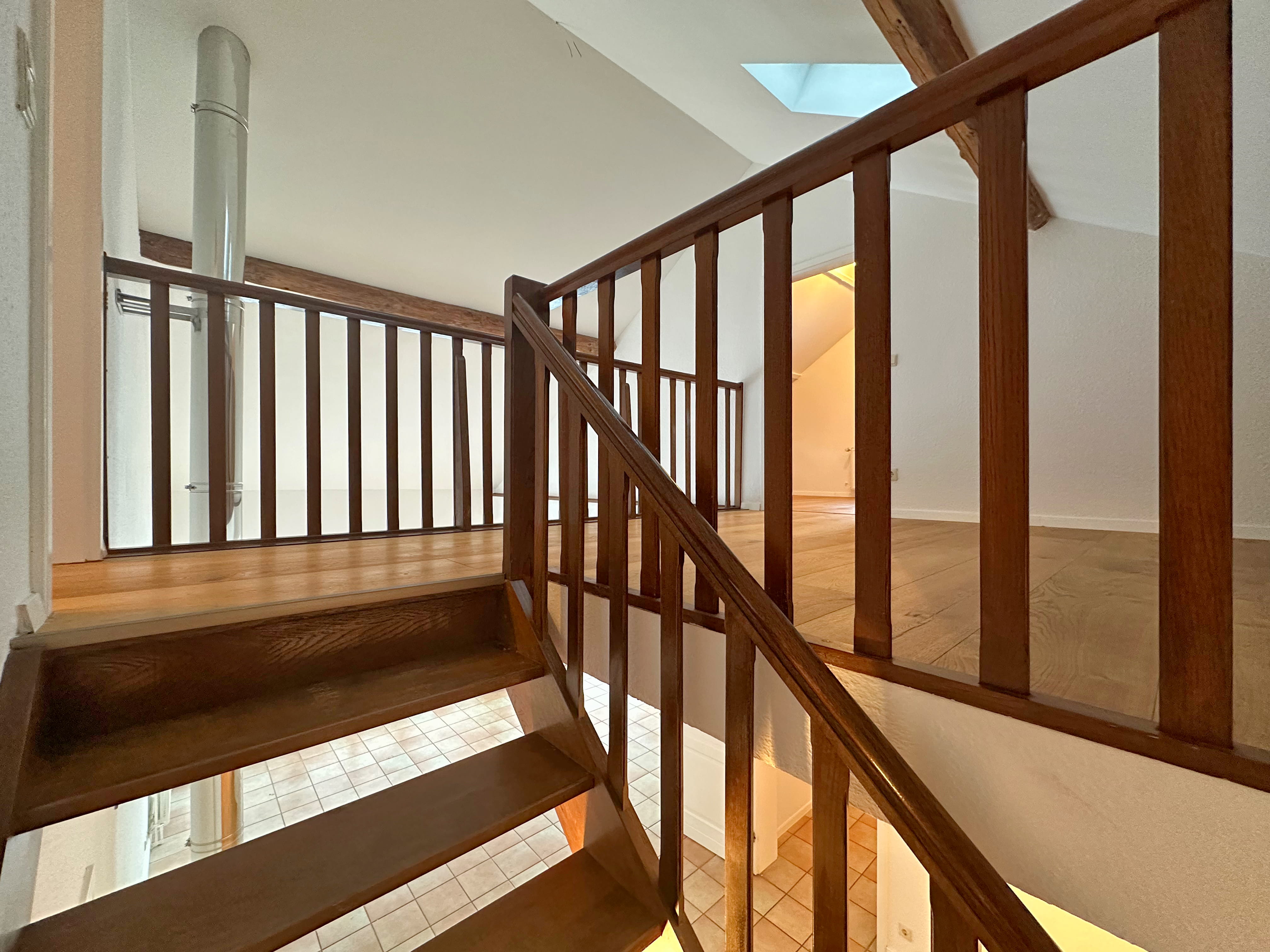 Ein echtes Highlight ist der großzügige Wohnbereich mit hoher Decke, der dem Raum sofort Weite gibt. Die sichtbare Galerieebene und die holzverkleidete Treppe unterstreichen den besonderen Charakter: warm, hochwertig und zeitlos.